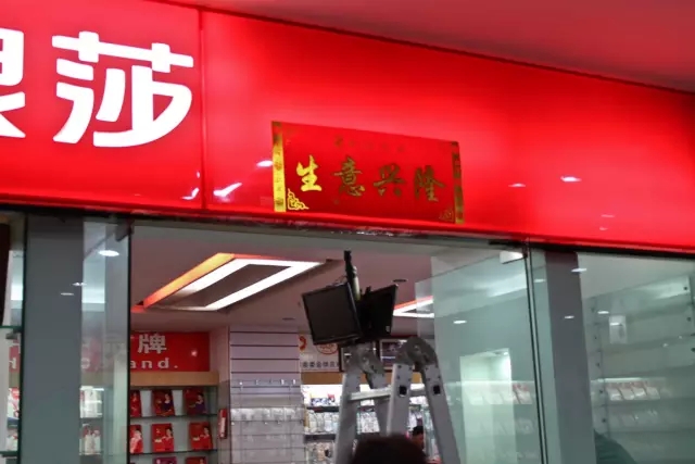 圖為浪莎員工正在手忙腳亂的貼剛剛從市委書記手中領到的春聯(lián):