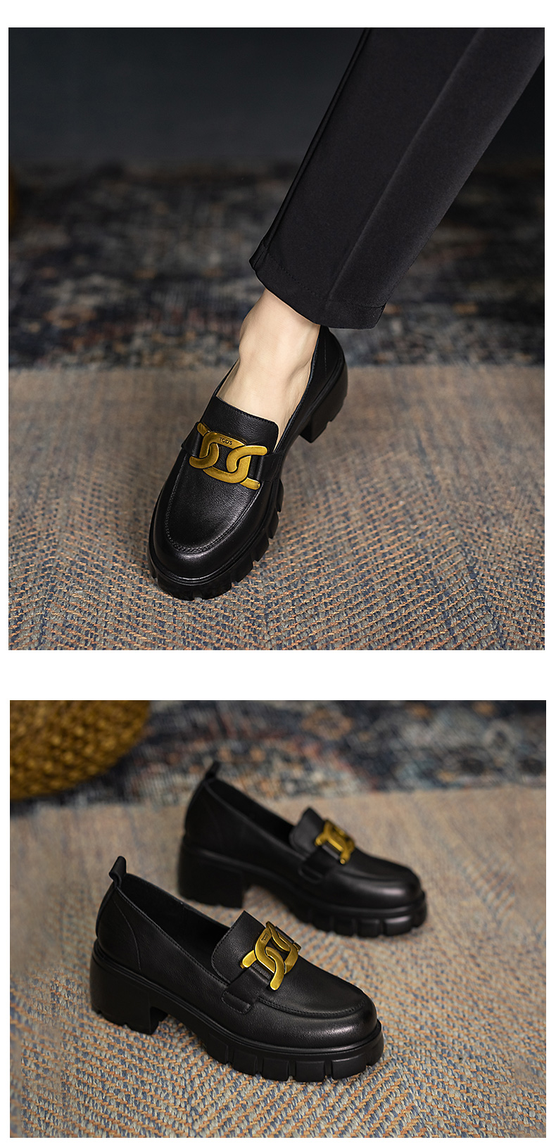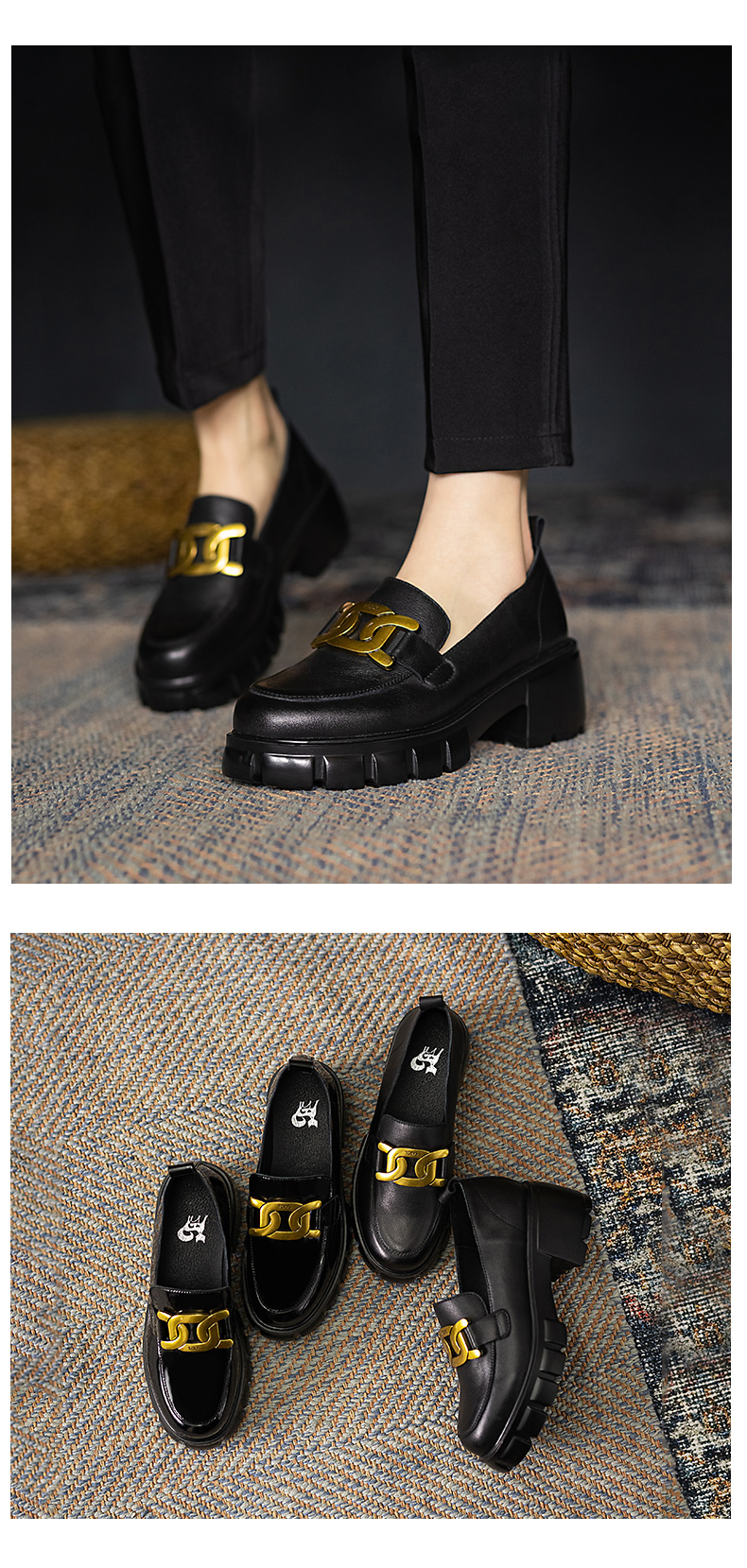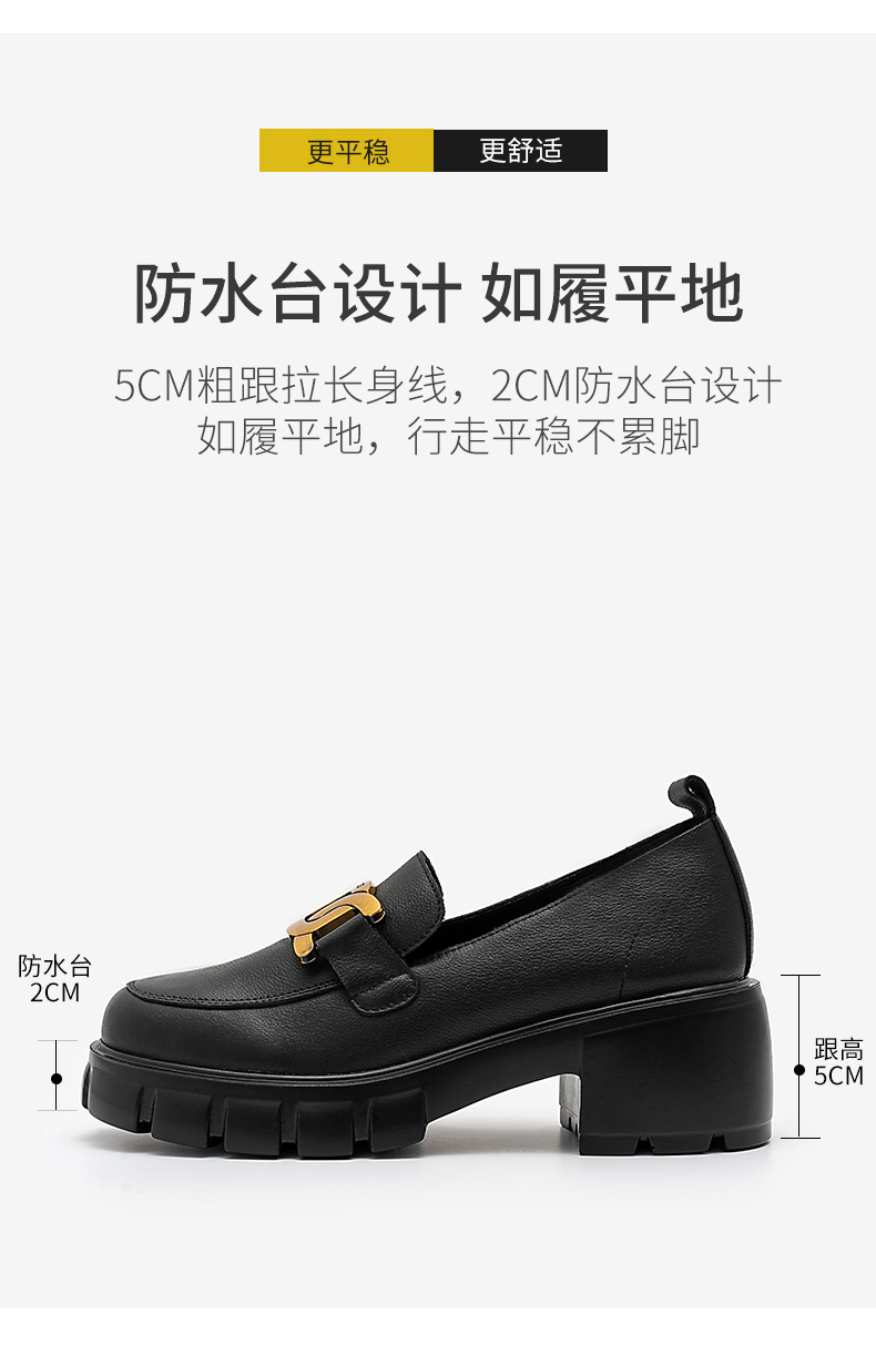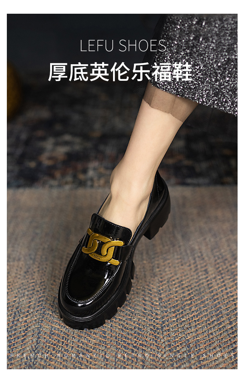 浪莎馬銜扣樂福鞋女英倫2021黑色真皮粗跟松糕一腳蹬厚底中跟單鞋