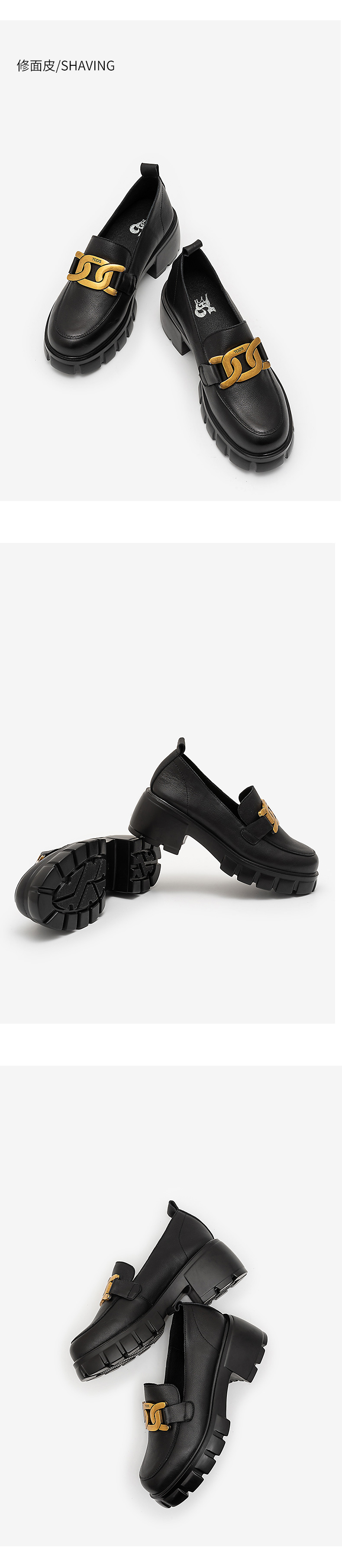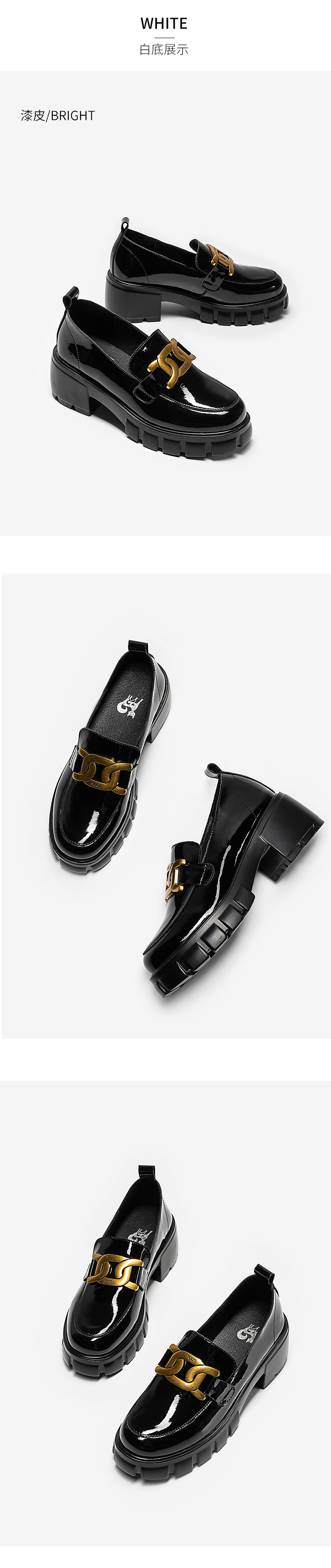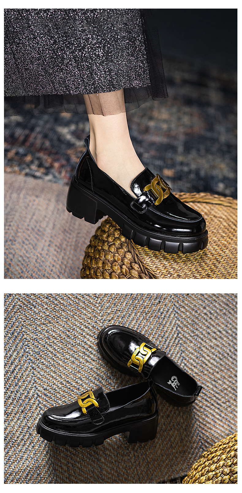 浪莎馬銜扣樂福鞋女英倫2021黑色真皮粗跟松糕一腳蹬厚底中跟單鞋